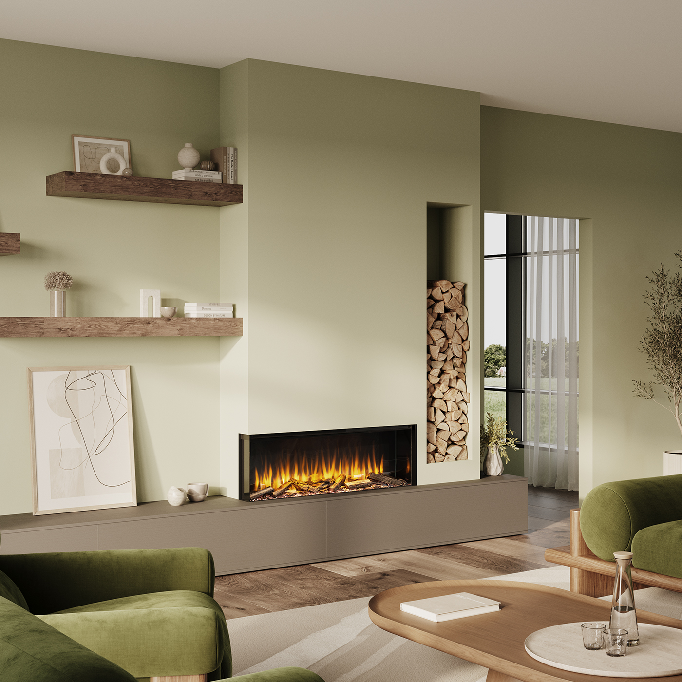 De haard is ontworpen om een statement te maken met onze ultra[1]realistische houtset die je naar binnen trekt en karakter toevoegt aan je huis. U kunt kiezen uit dertien kleuren voor zowel het branderbed als de optionele ledverlichting, zodat u uw haard kunt afstemmen op uw stemming en omgeving.