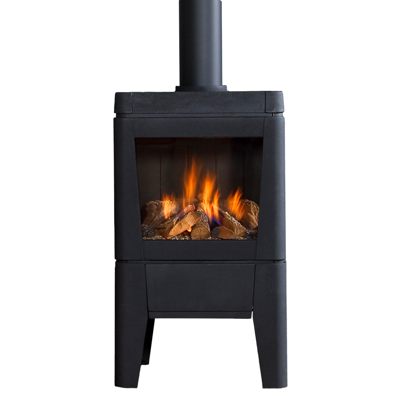 De Faber Odense is een kleine moderne gaskachel met een vermogen van 6,1KW. De vrijstaande kachel is mooi matzwart en u bekijkt het vuur vanaf 3 zijdes.